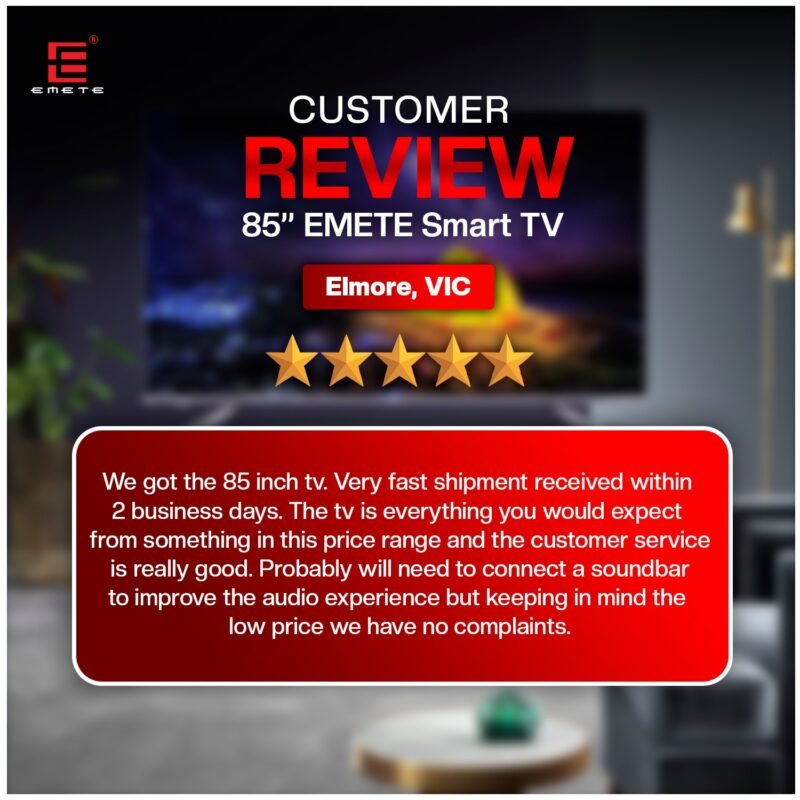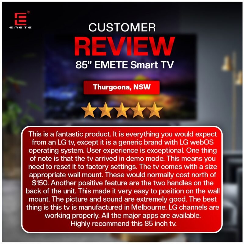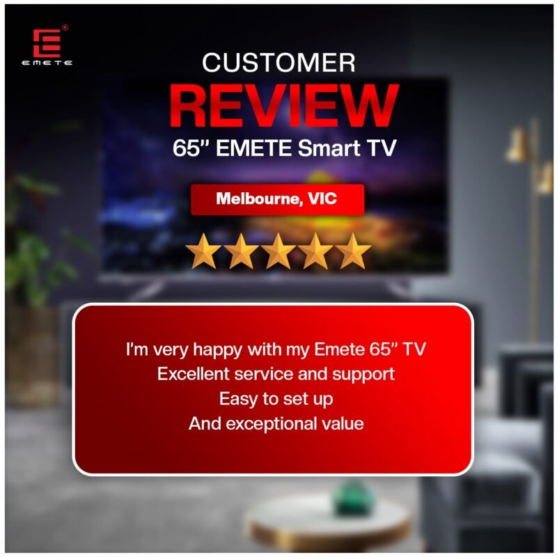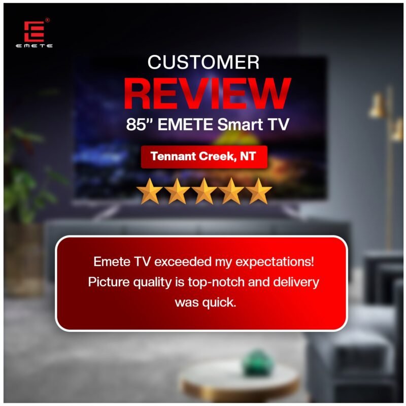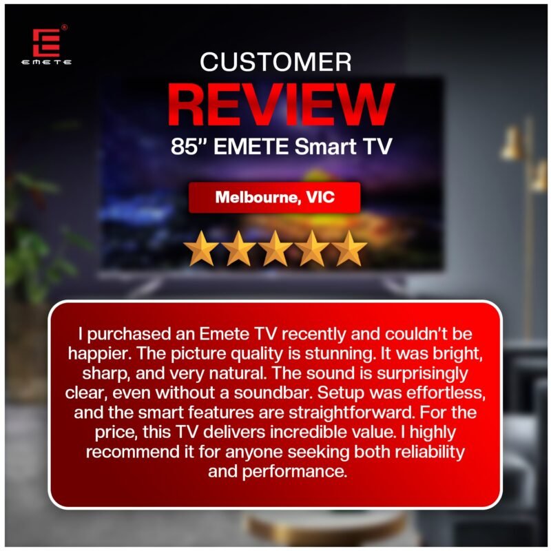 At Emete, our 4K UHD Smart TVs from 55” to 100” run on webOS, delivering stunning visuals and quick access to all your favourite streaming apps. Our Portable Smart TVs (21.5”, 27”, 32”) use Android, perfect for travel and outdoor fun. Each TV includes a wall mount, is fully Australian compliant, energy efficient, and comes with a 3-year warranty. Whether you’re binge-watching, streaming live sports, or gaming, Emete brings premium 4K UHD entertainment straight to you.